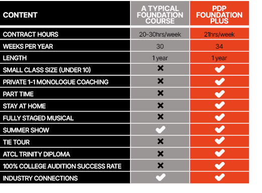 Unlike a standard foundation course students benefit from being part of the PDP training theatre company and participate in two major productions during the year. Students successfully completing the PDP Foundation Plus course will receive an ATCL Diploma (Level 4) qualification in Musical Theatre or Performing Arts from Trinity College.